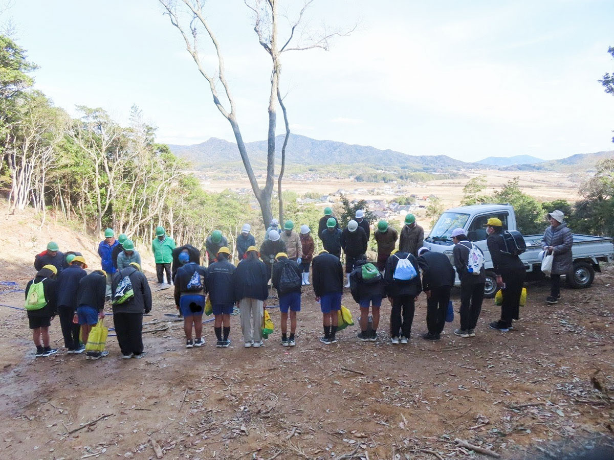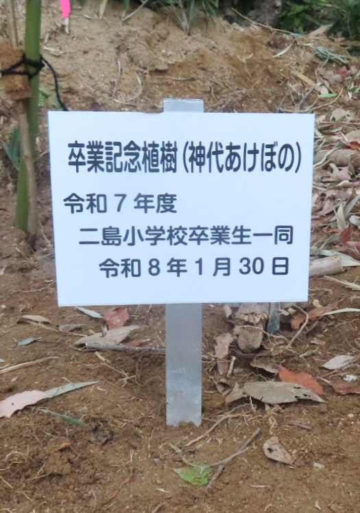 二島小学校6年生 卒業記念の桜を植樹 2026年2月7日 1月30日、二島小学校の6年生15名が、朝日山で卒業記念の桜を植樹しました 。この活動は「竹林ボランティア山口南」の会員や地域住民の協力のもと、4年前から続けられているものです 。 今年は県の補助事業として「神代あけぼの」の苗木が用意されました 。児童たちは会員のサポートを受けながら、竹の伐採跡が残る山の斜面に、一株ずつ丁寧に苗木を植えていきました 。 作業の最後には、自分の名前を書いたプレートを木の枝に結びつけました 。児童たちは「大きくなれ!」と願いを込めながら、成長していく桜に自分たちの将来の抱負を誓っていました 。 山の斜面 終わりの挨拶 看板